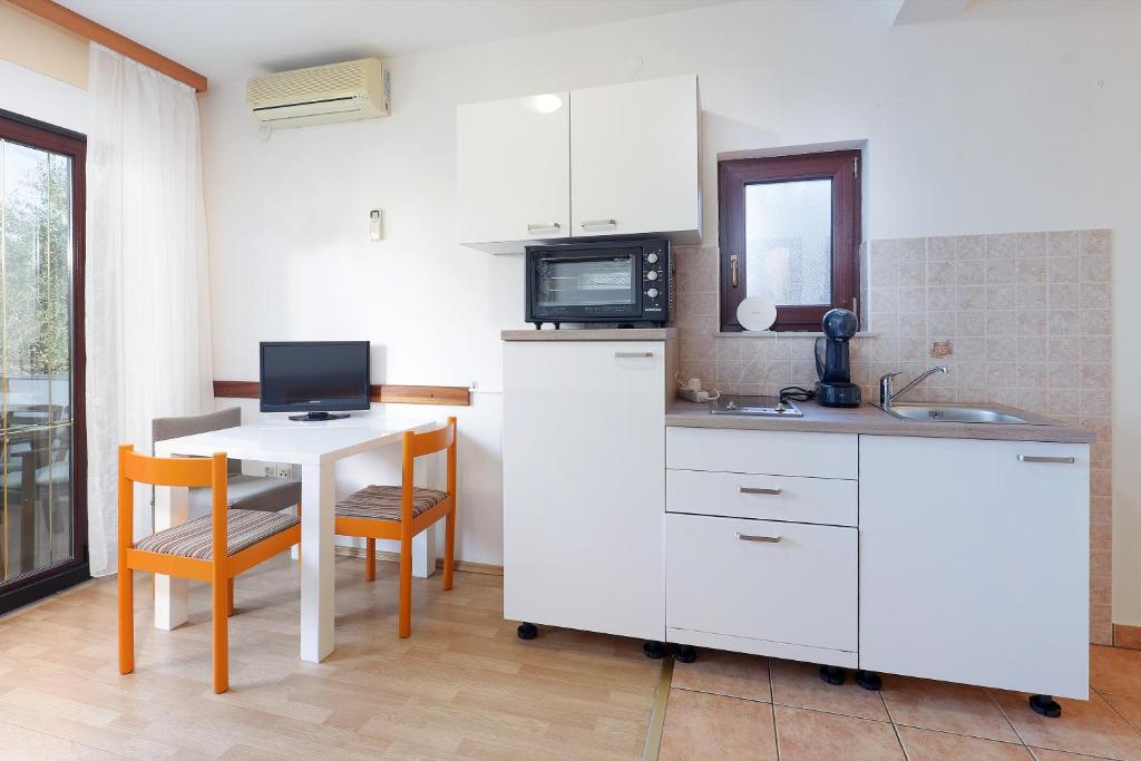 The apartment boasts a fully equipped kitchenette complete with a dining area, where you can prepare and enjoy meals at your convenience. Appliances include a refrigerator, coffee machine, microwave, dishwasher, oven, stovetop, toaster, and electric kettle. Additionally, outdoor furniture is provided for al fresco dining on the balcony or terrace.