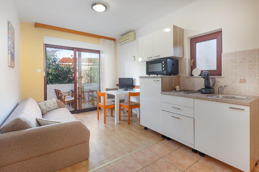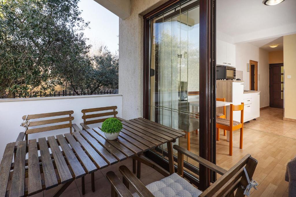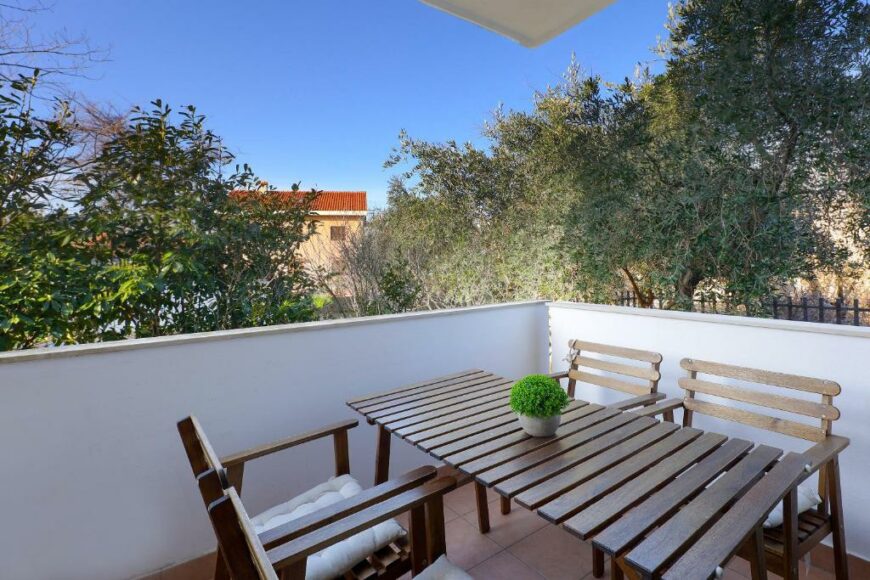 As you step into the apartment, you’ll be greeted by a bright and airy living space, tastefully furnished with a cozy sofa and a flat-screen TV with satellite channels. The living room opens up to a charming balcony overlooking the garden, providing a serene spot to relax and enjoy the surroundings.