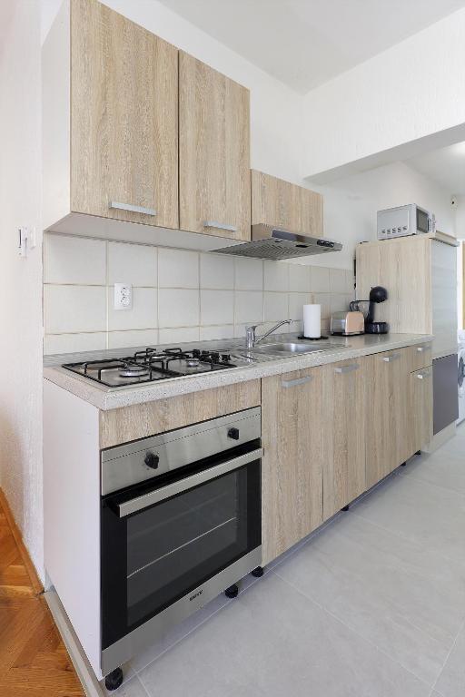 The apartment’s kitchen is fully equipped with modern appliances, including a stovetop, refrigerator, dishwasher, and kitchenware, allowing you to prepare meals with ease. Additionally, a coffee machine, microwave, and toaster are provided for your convenience.