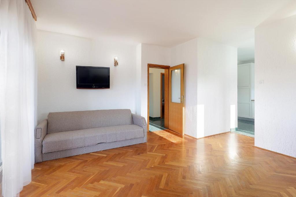 The living room is tastefully furnished, providing a cozy spot to relax and unwind after a day of exploration. Enjoy your favorite shows on the flat-screen TV with satellite channels, or simply take in the breathtaking views of the sea, lake, and garden from the balcony or terrace.